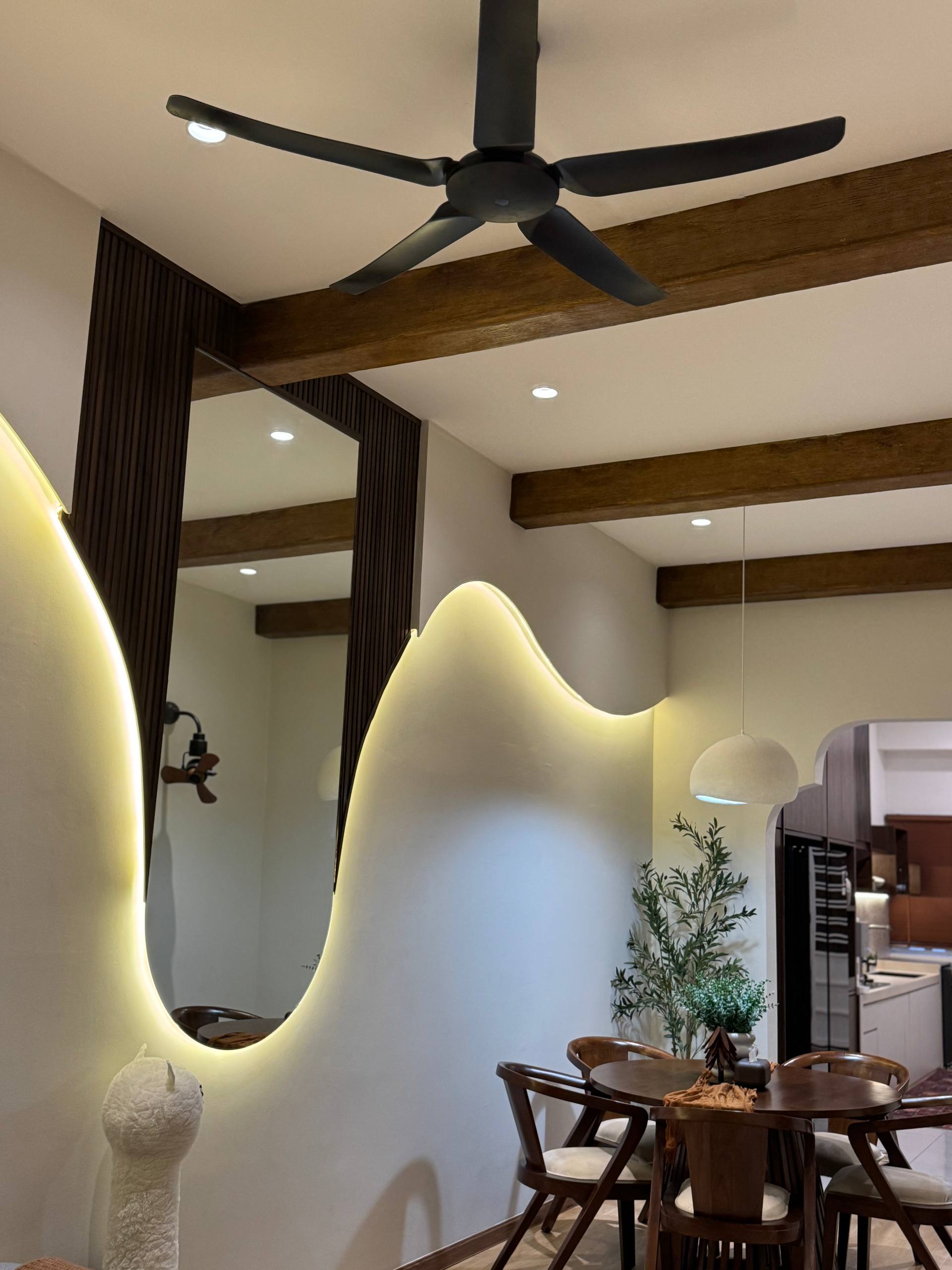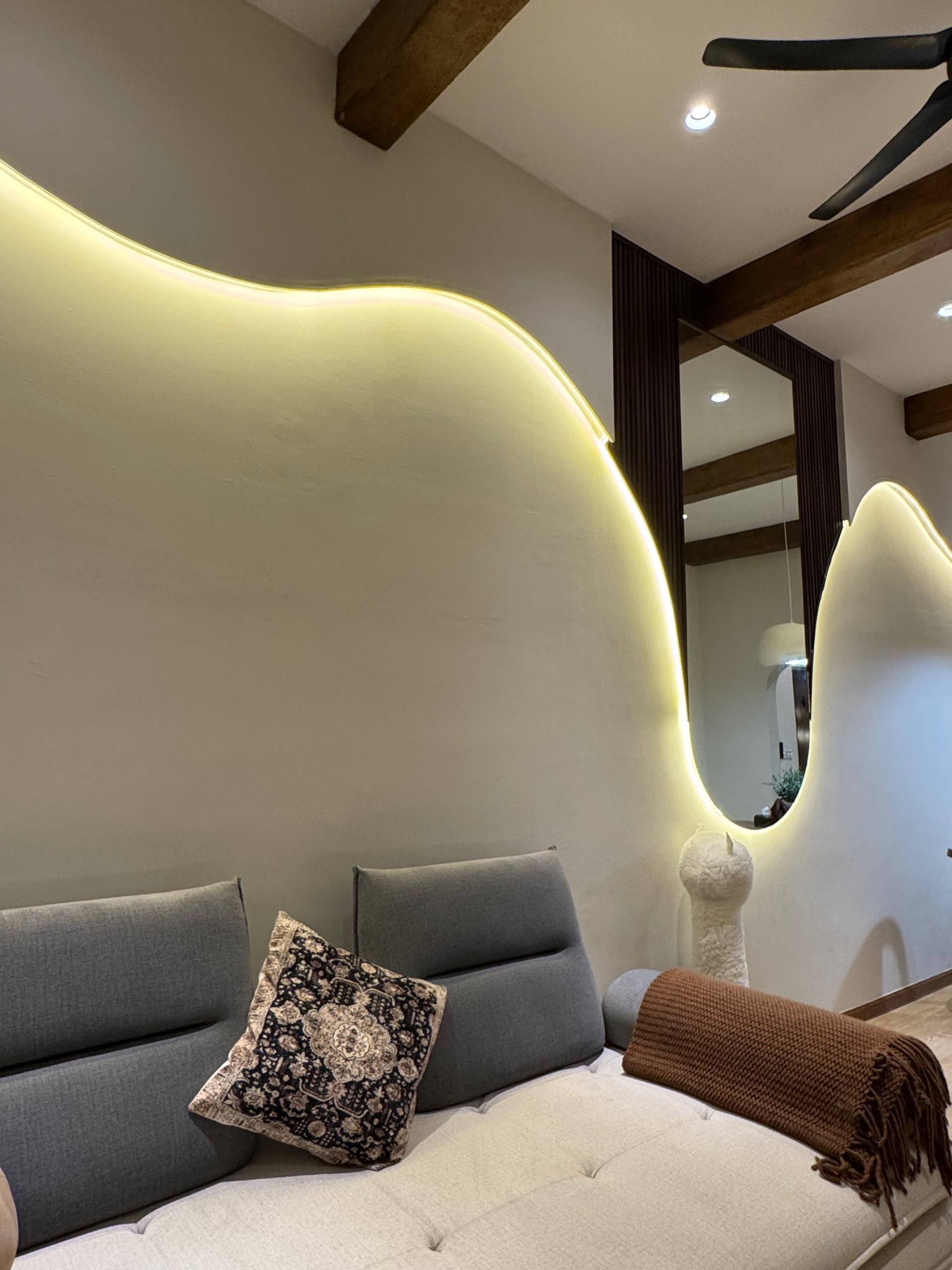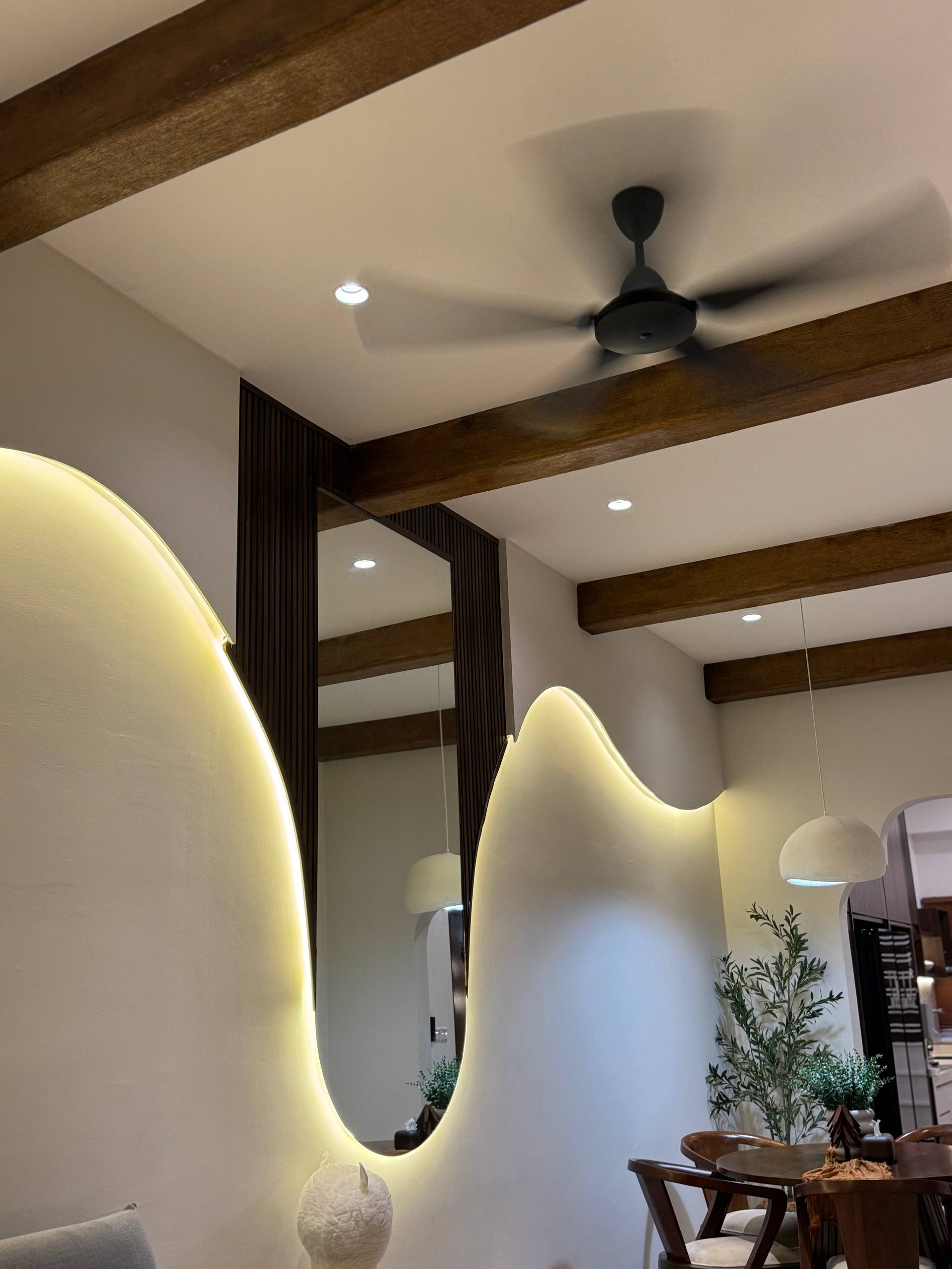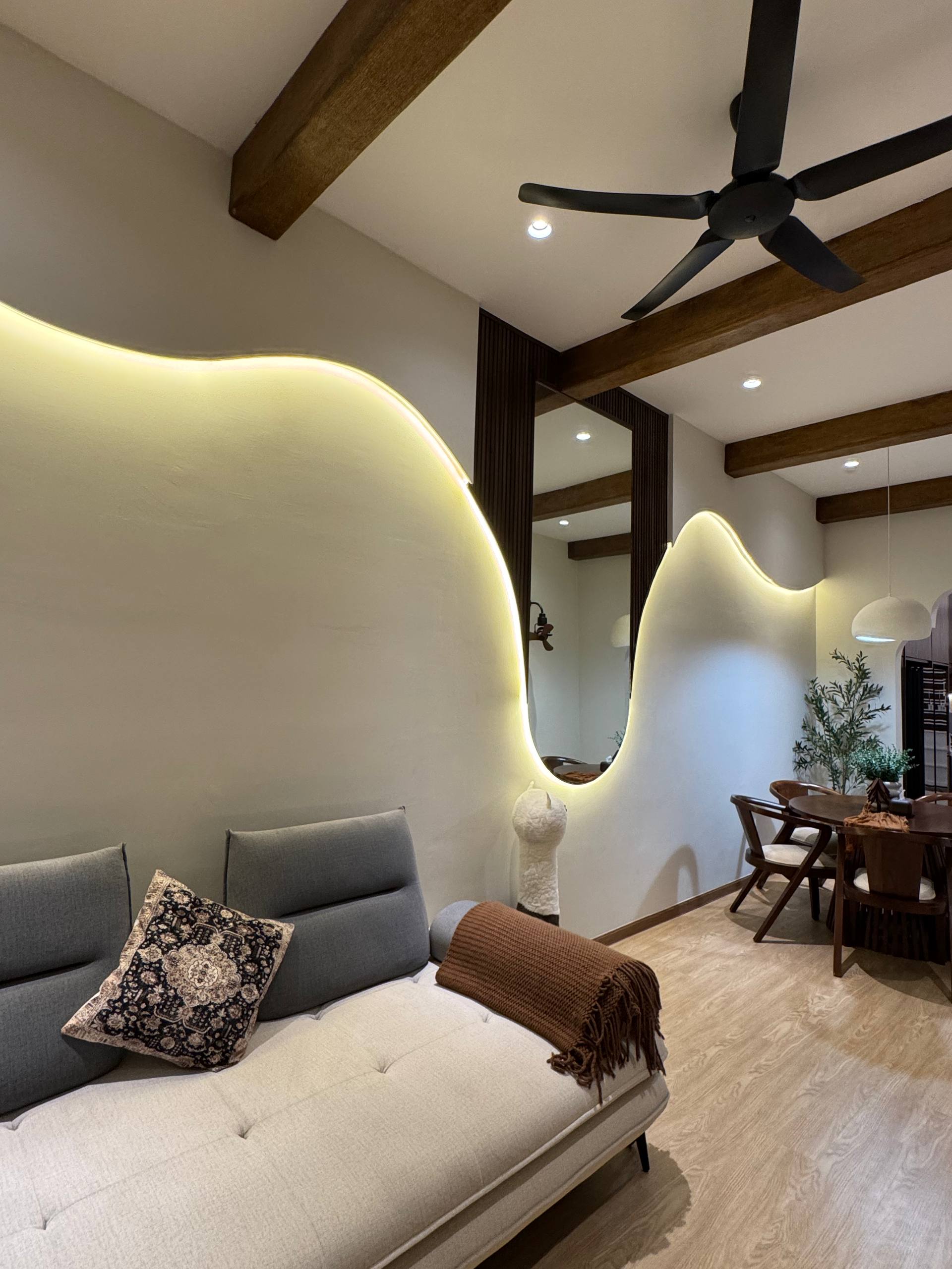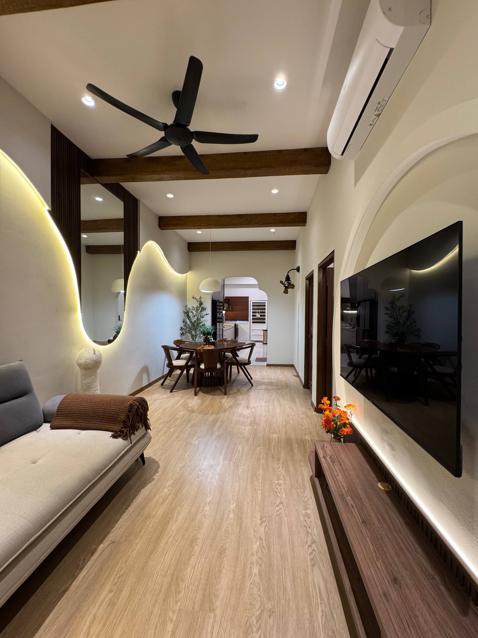 Living Area: SPC flooring installation, feature wall with integrated lighting, custom TV cabinet, faux ceiling beams, and inverted mirror with fluted wall design.