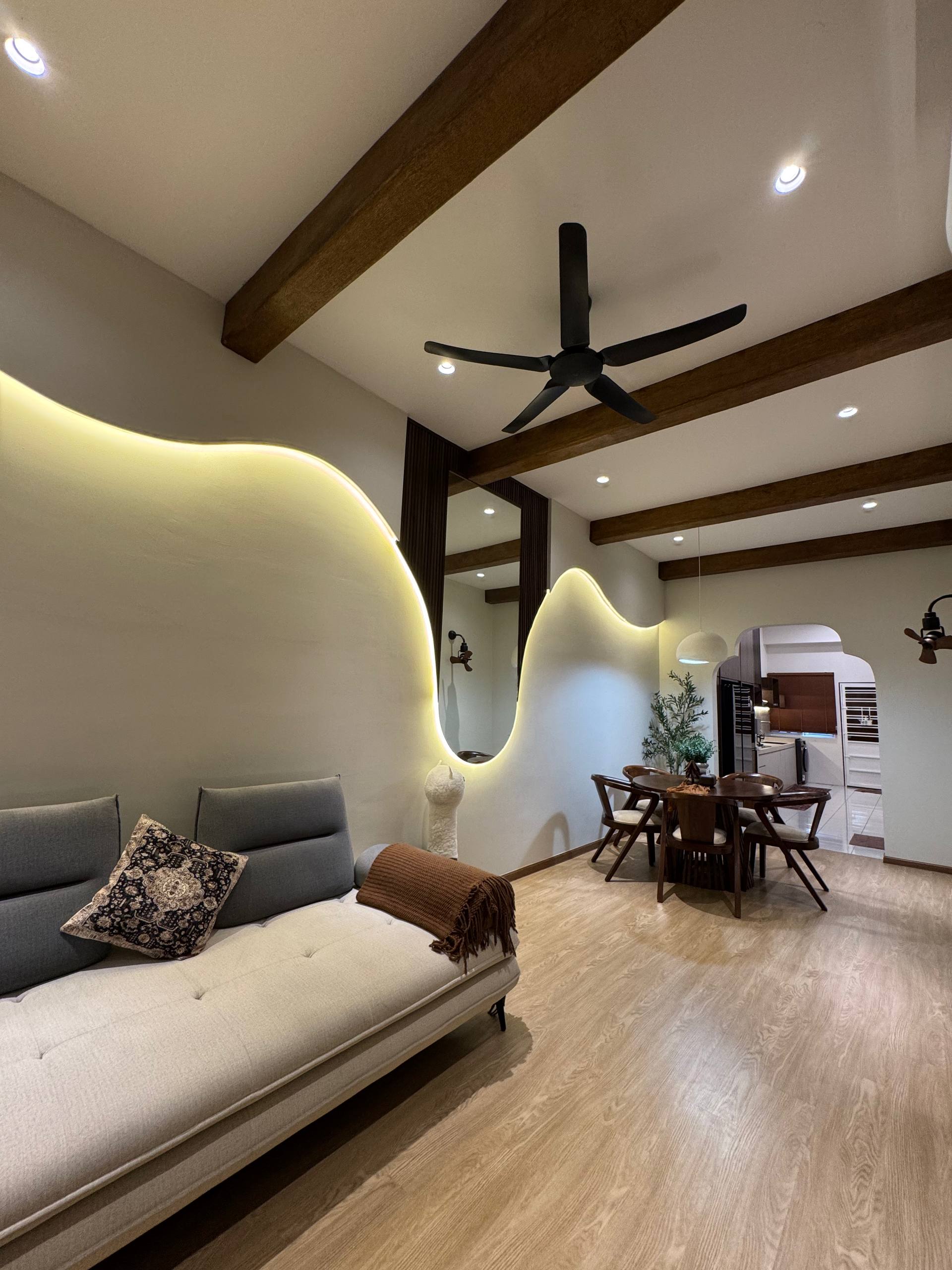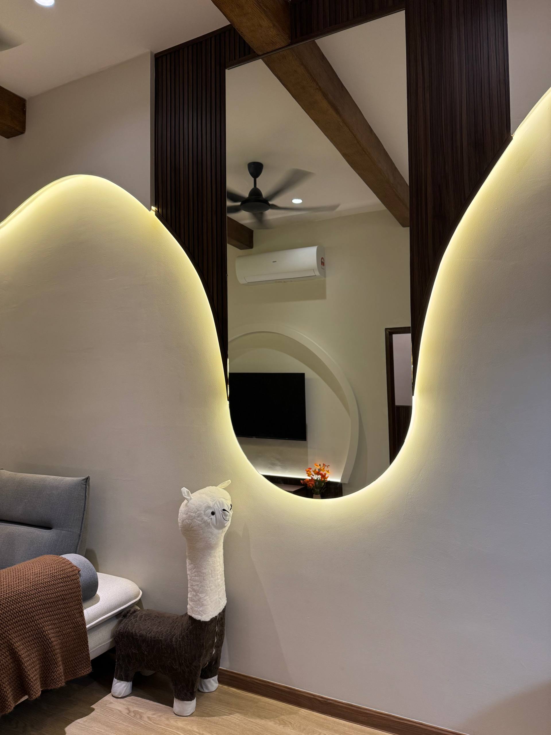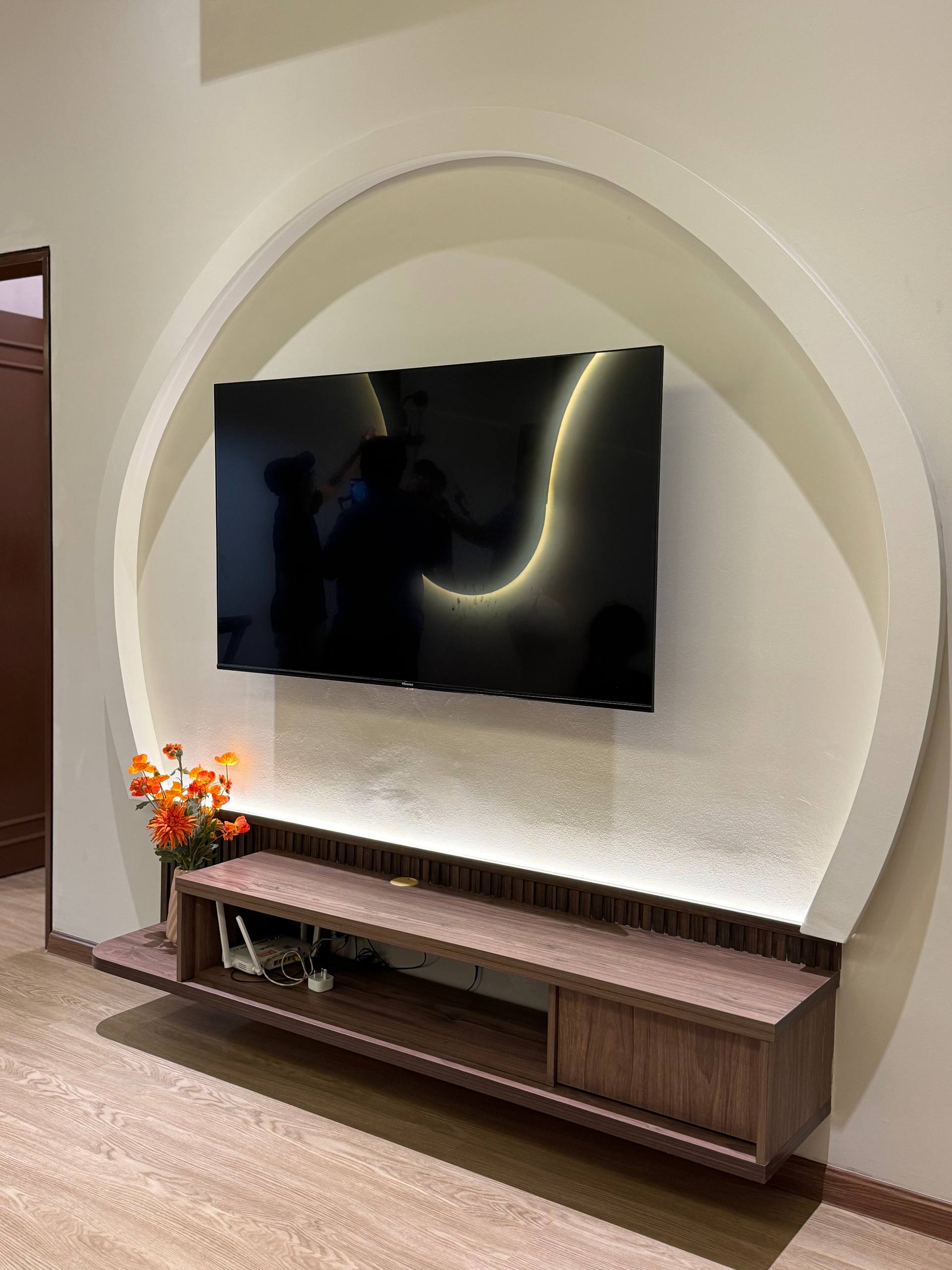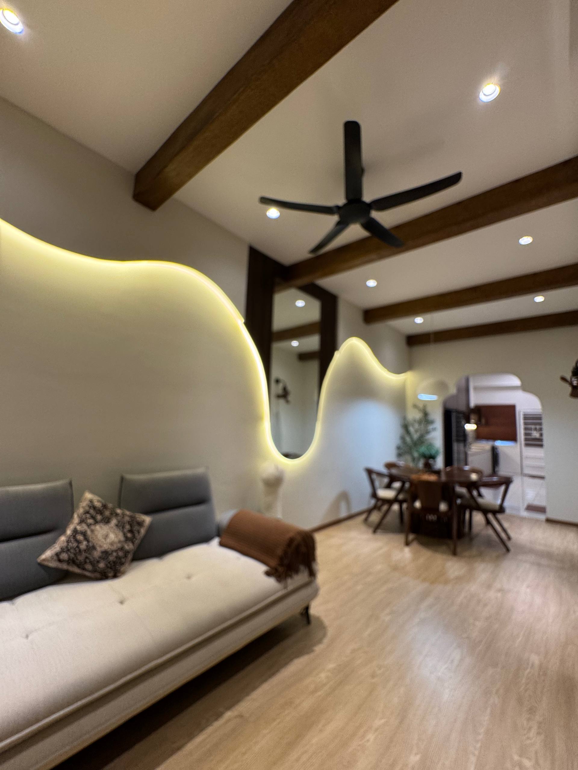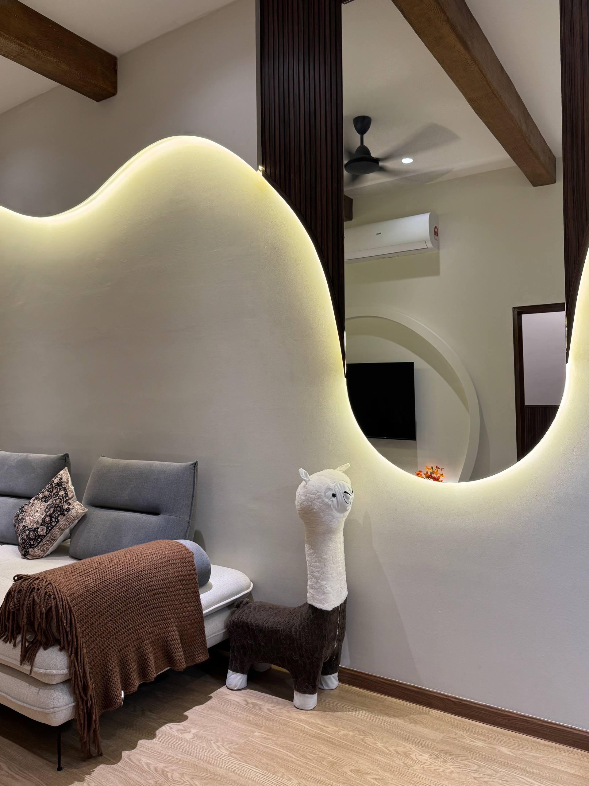 Living Area: SPC flooring installation, feature wall with integrated lighting, custom TV cabinet, faux ceiling beams, and inverted mirror with fluted wall design.