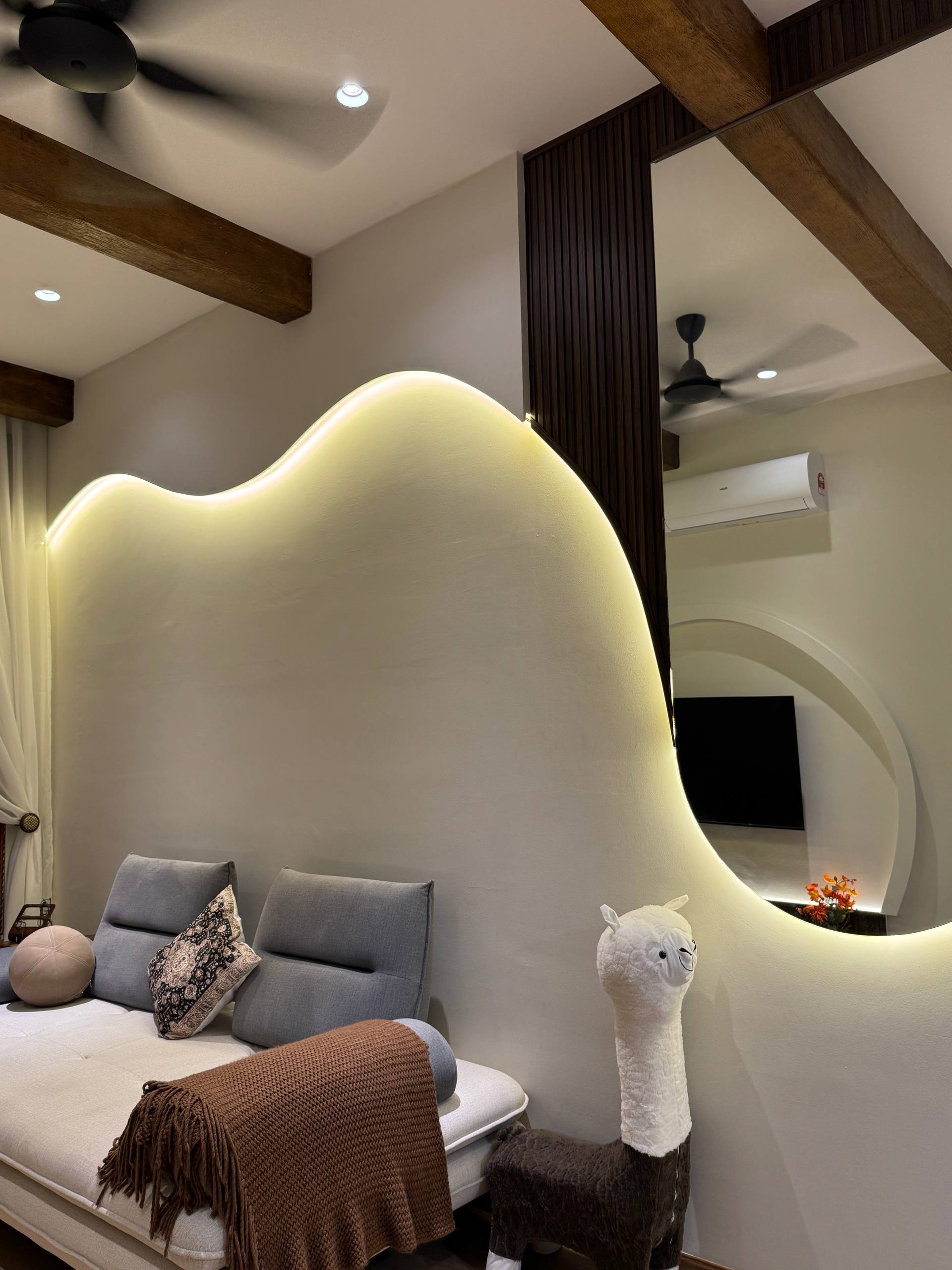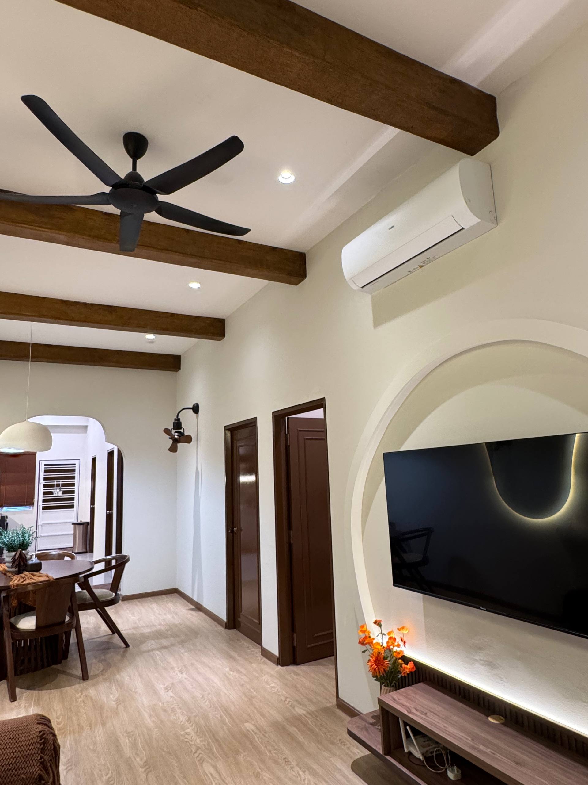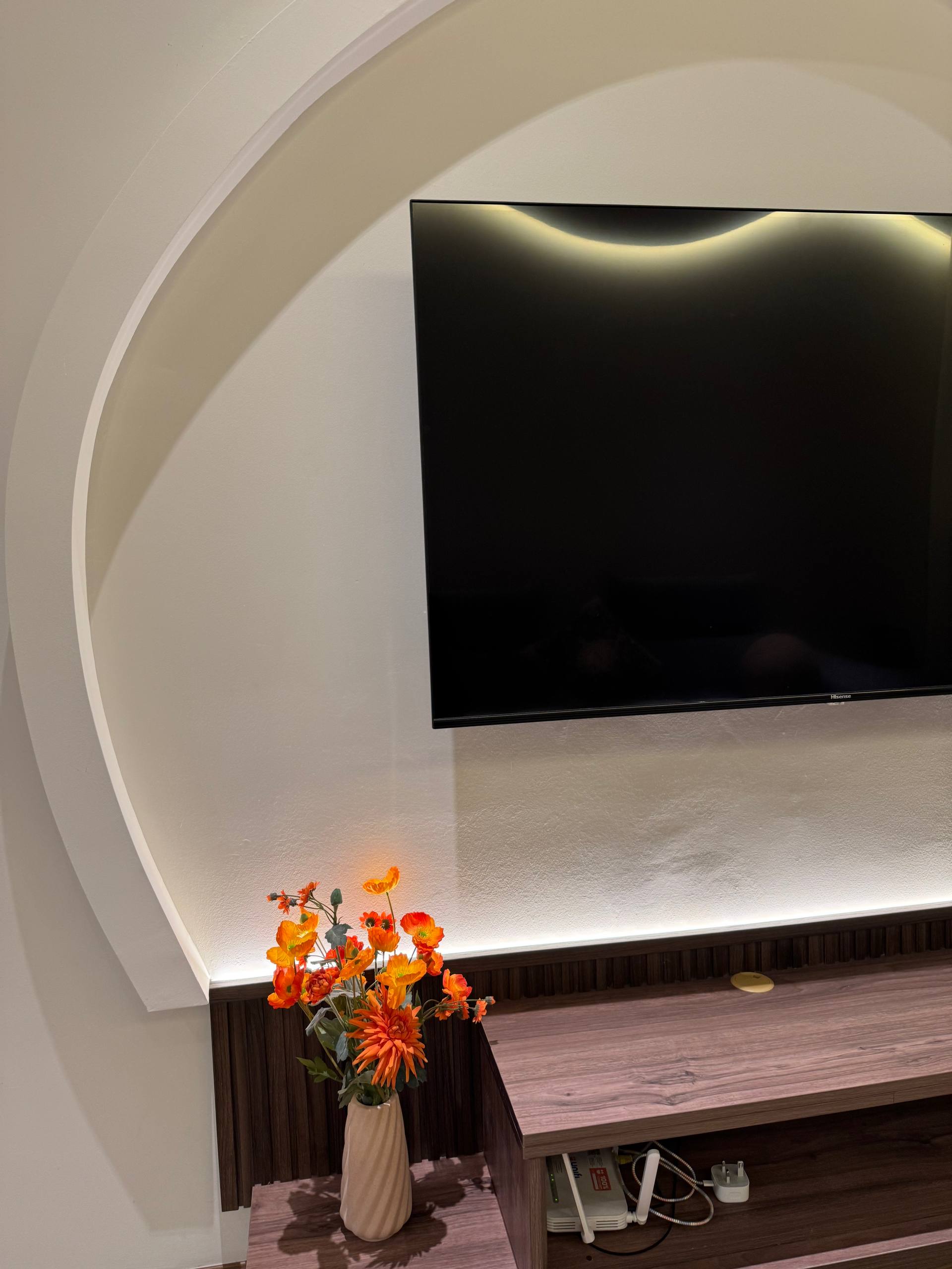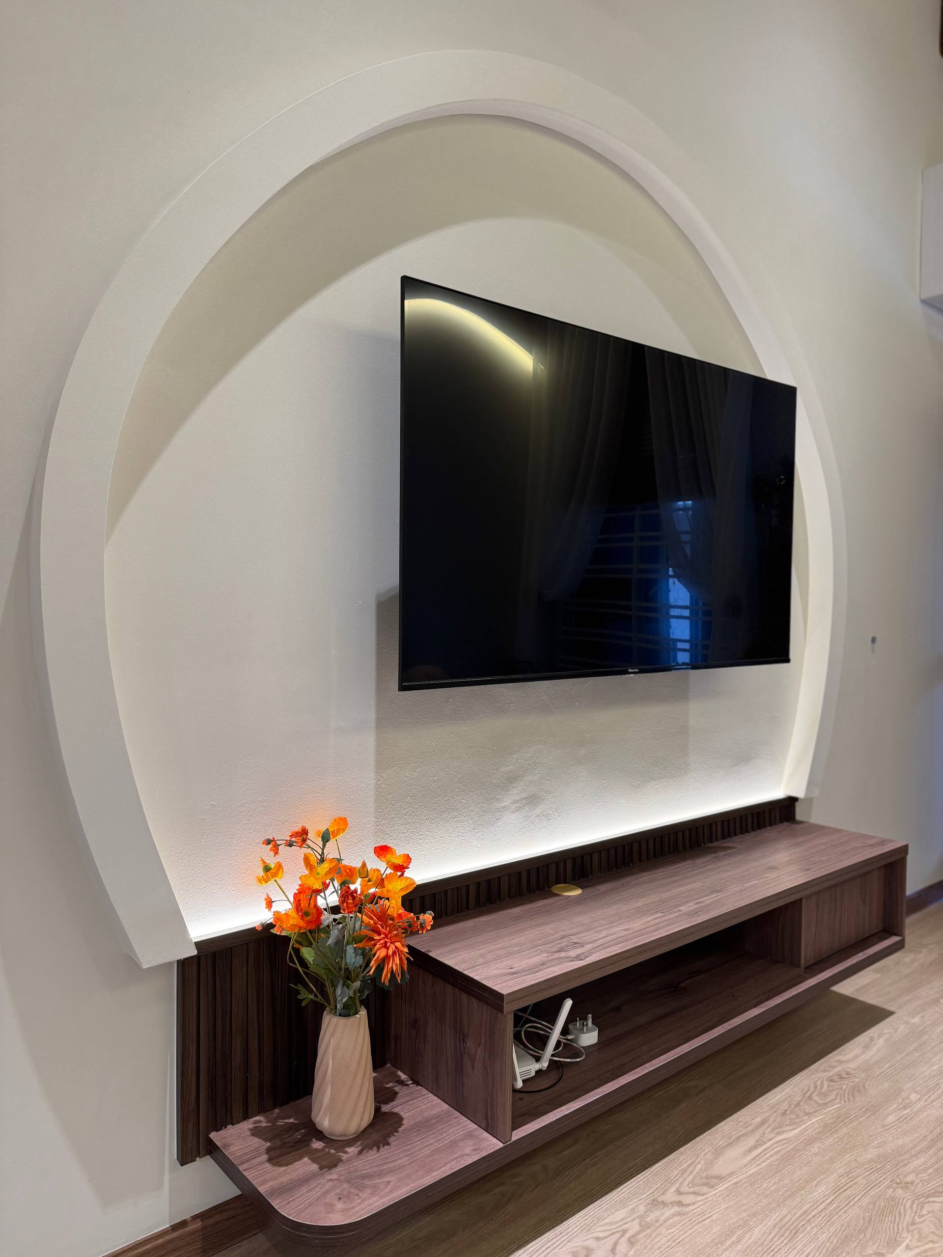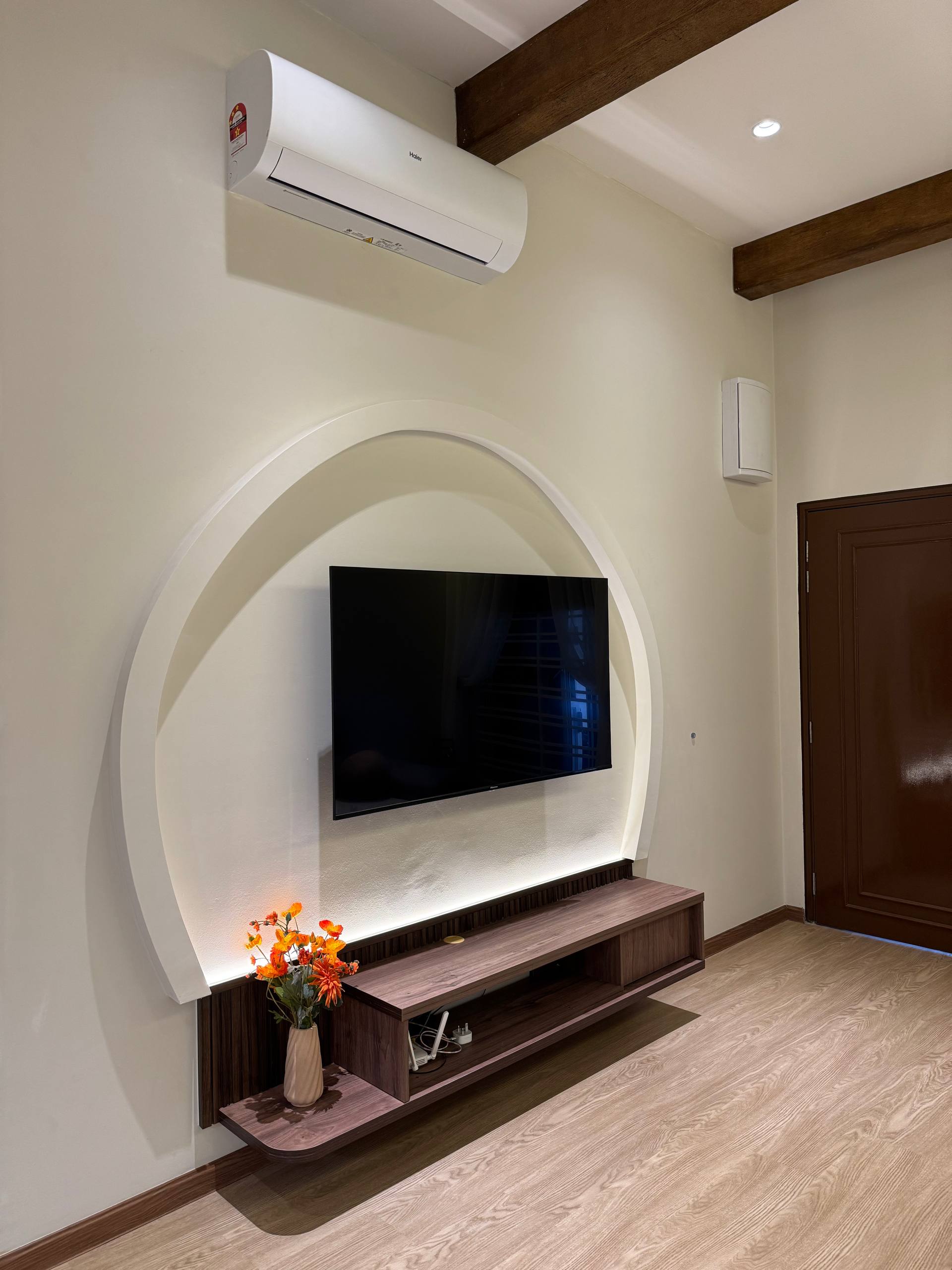 Living Area: SPC flooring installation, feature wall with integrated lighting, custom TV cabinet, faux ceiling beams, and inverted mirror with fluted wall design.