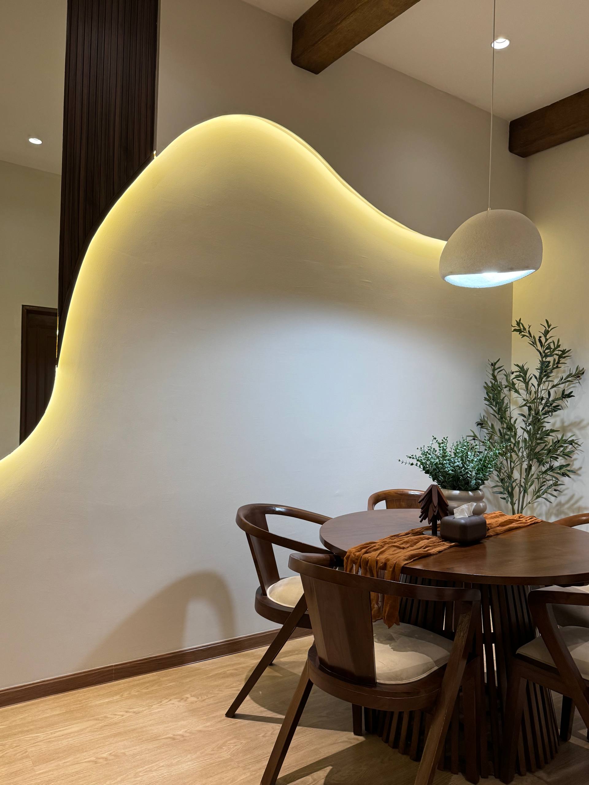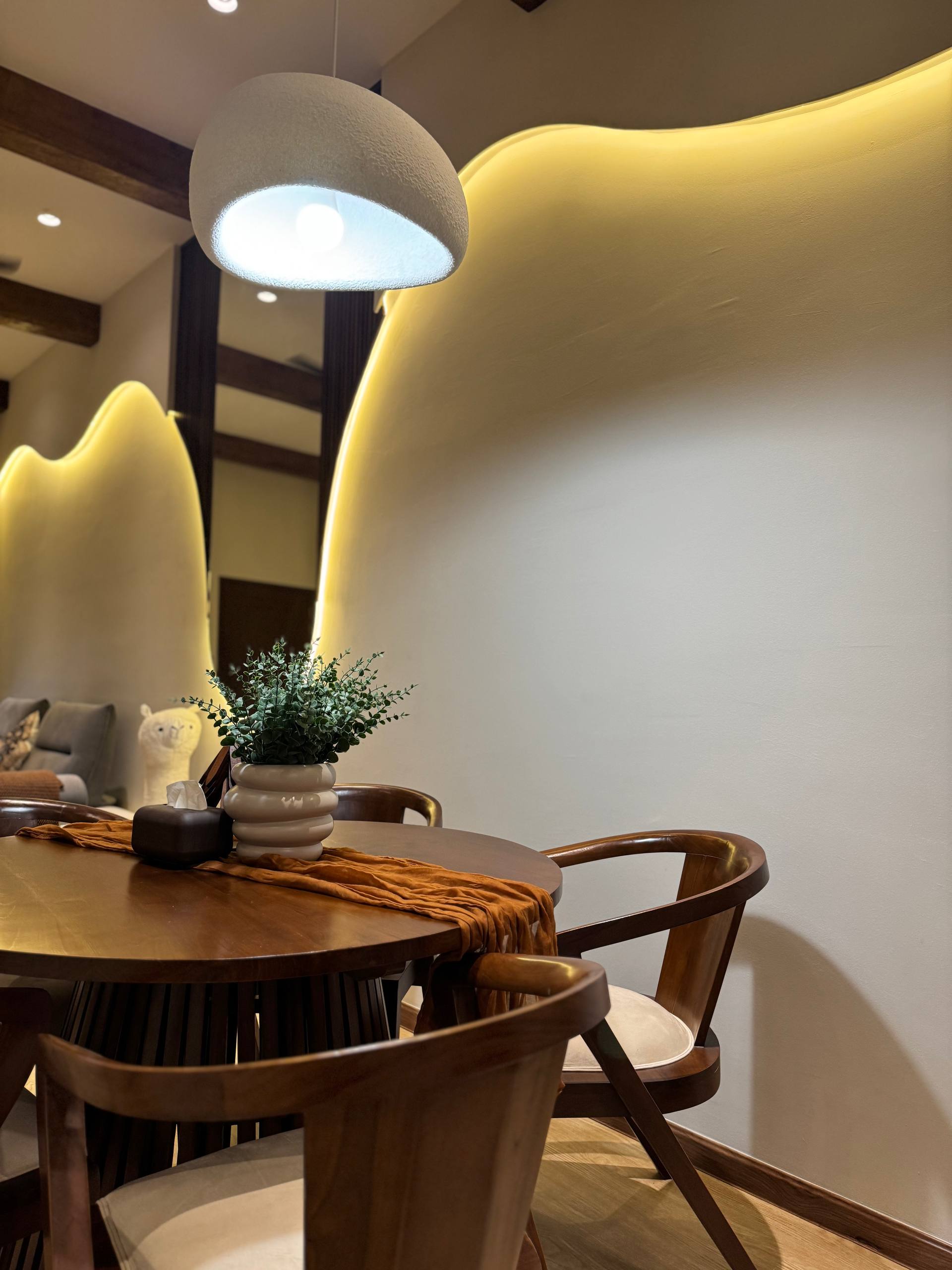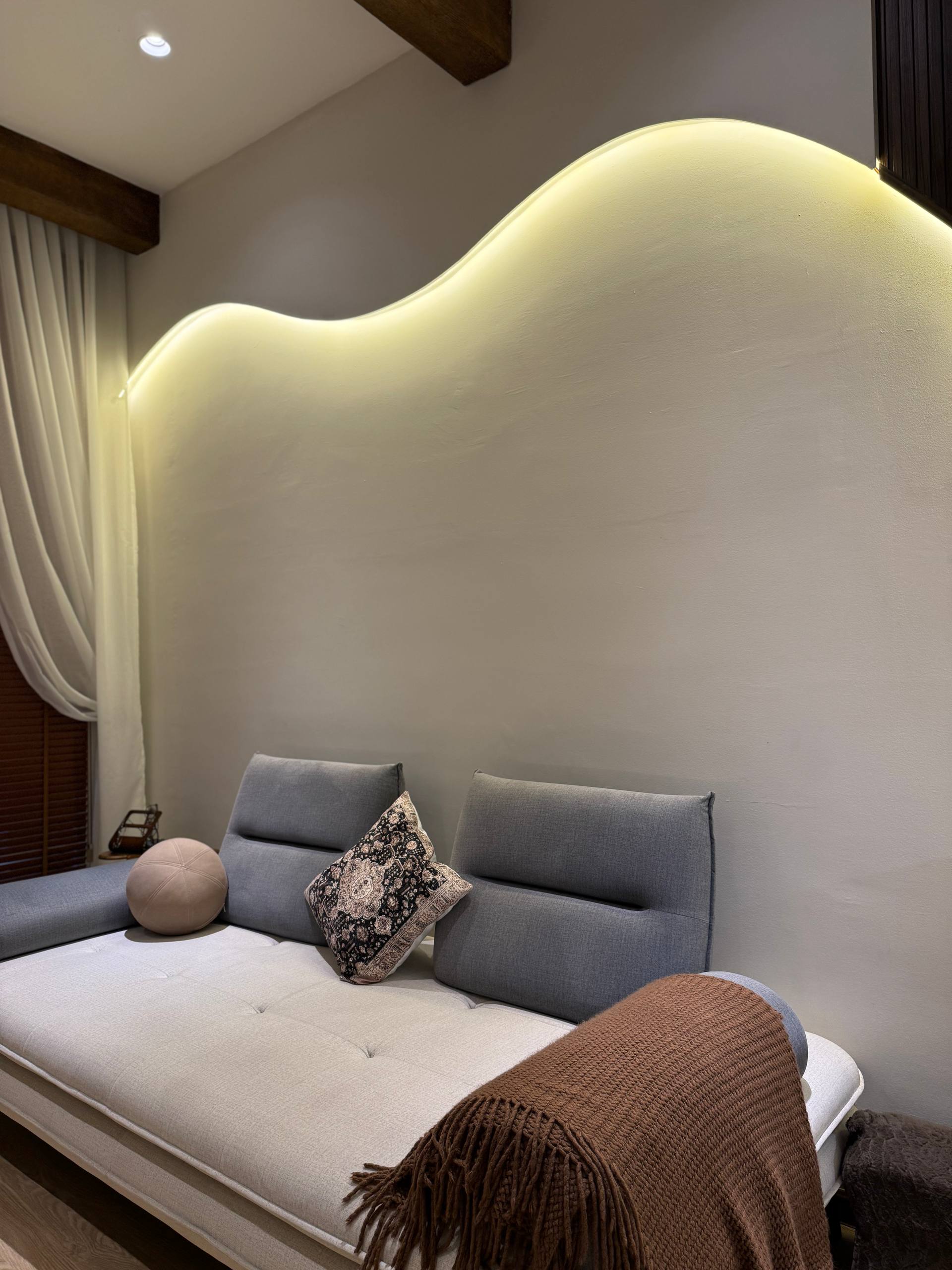 Concept: Modern warm interior emphasizing texture, lighting, and natural materials for a cozy yet elegant ambiance.