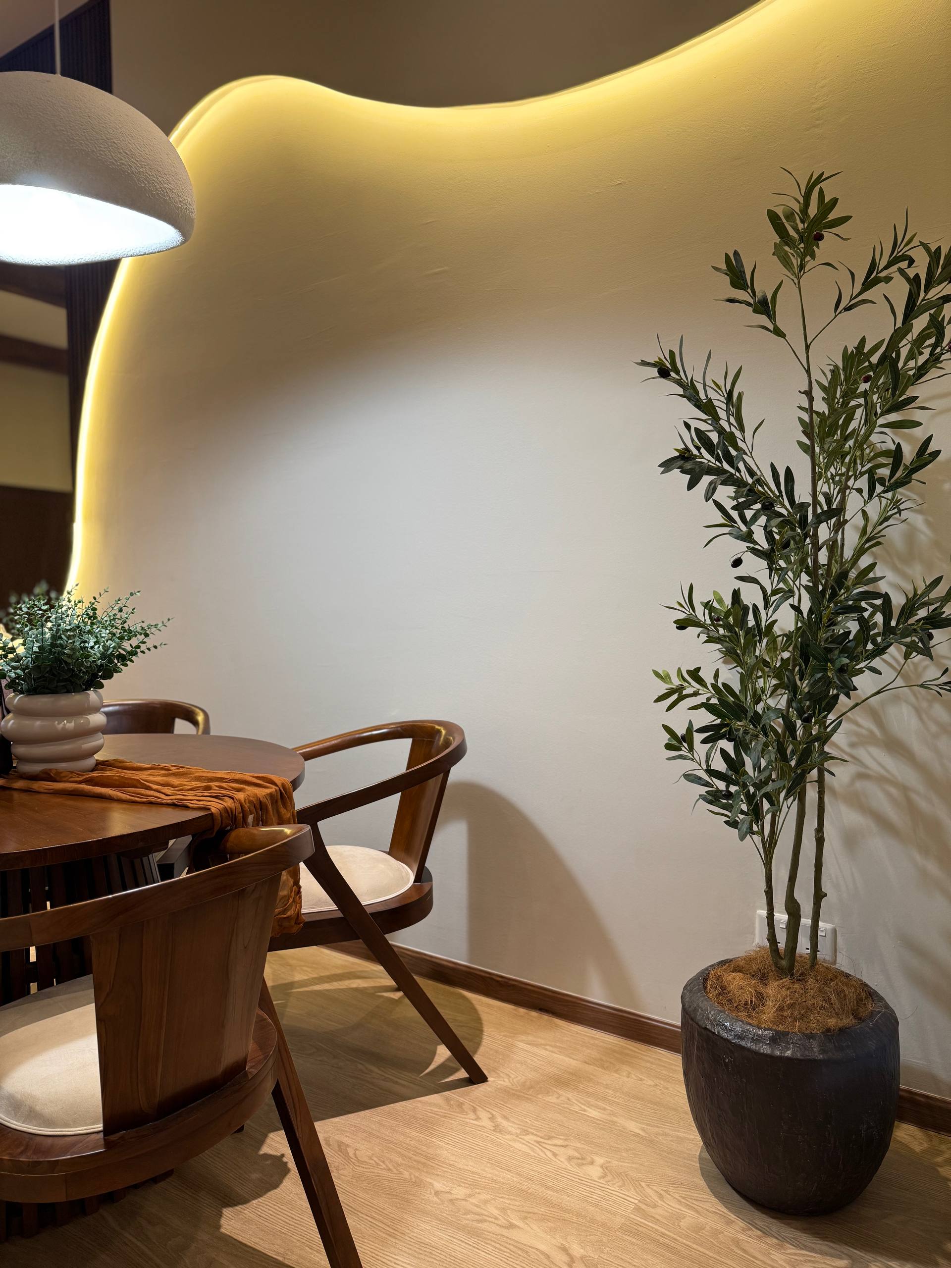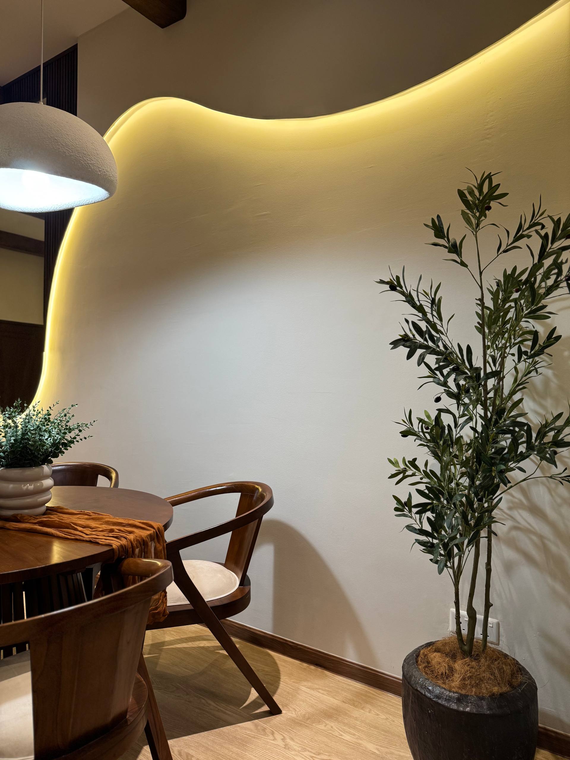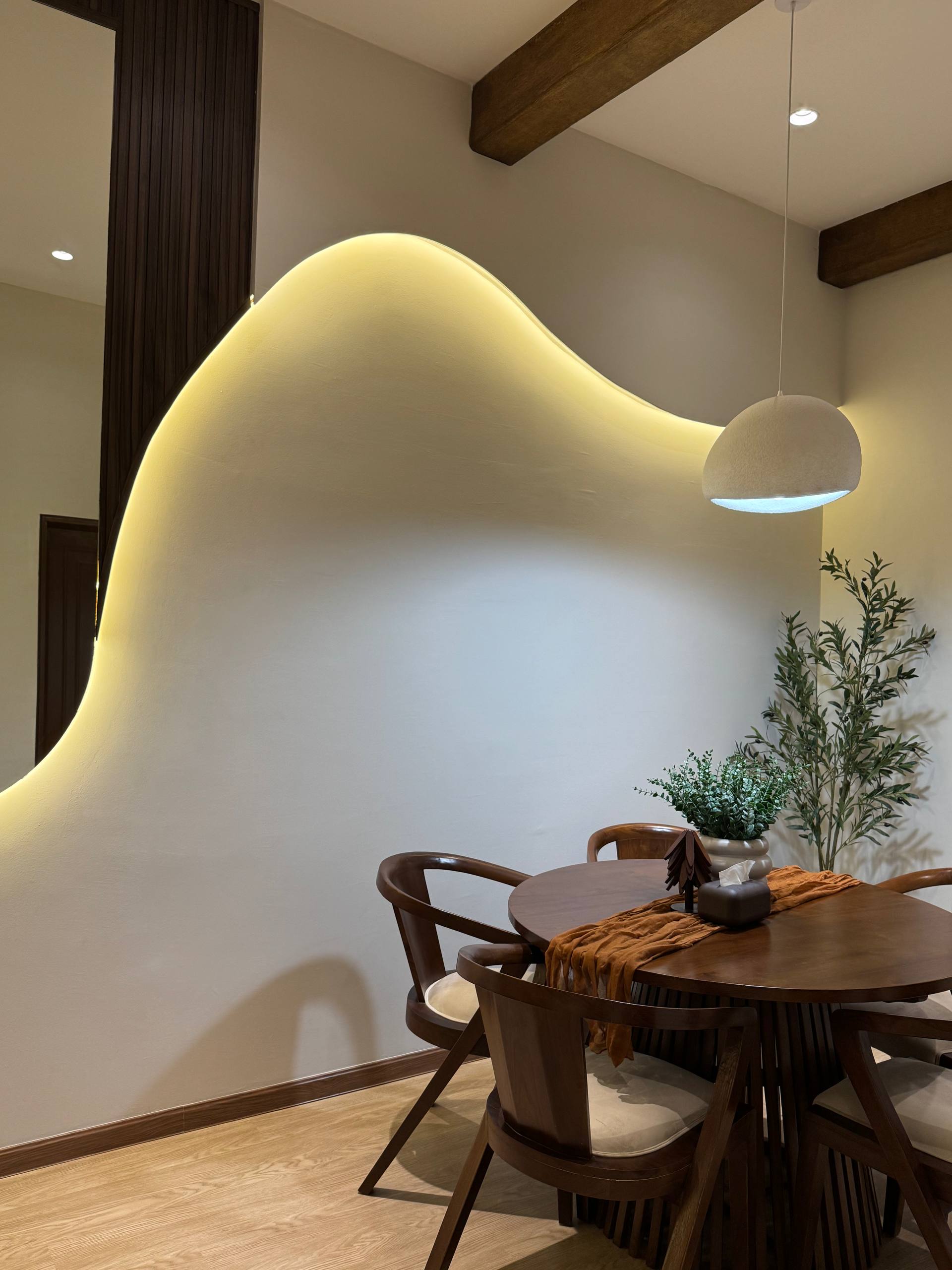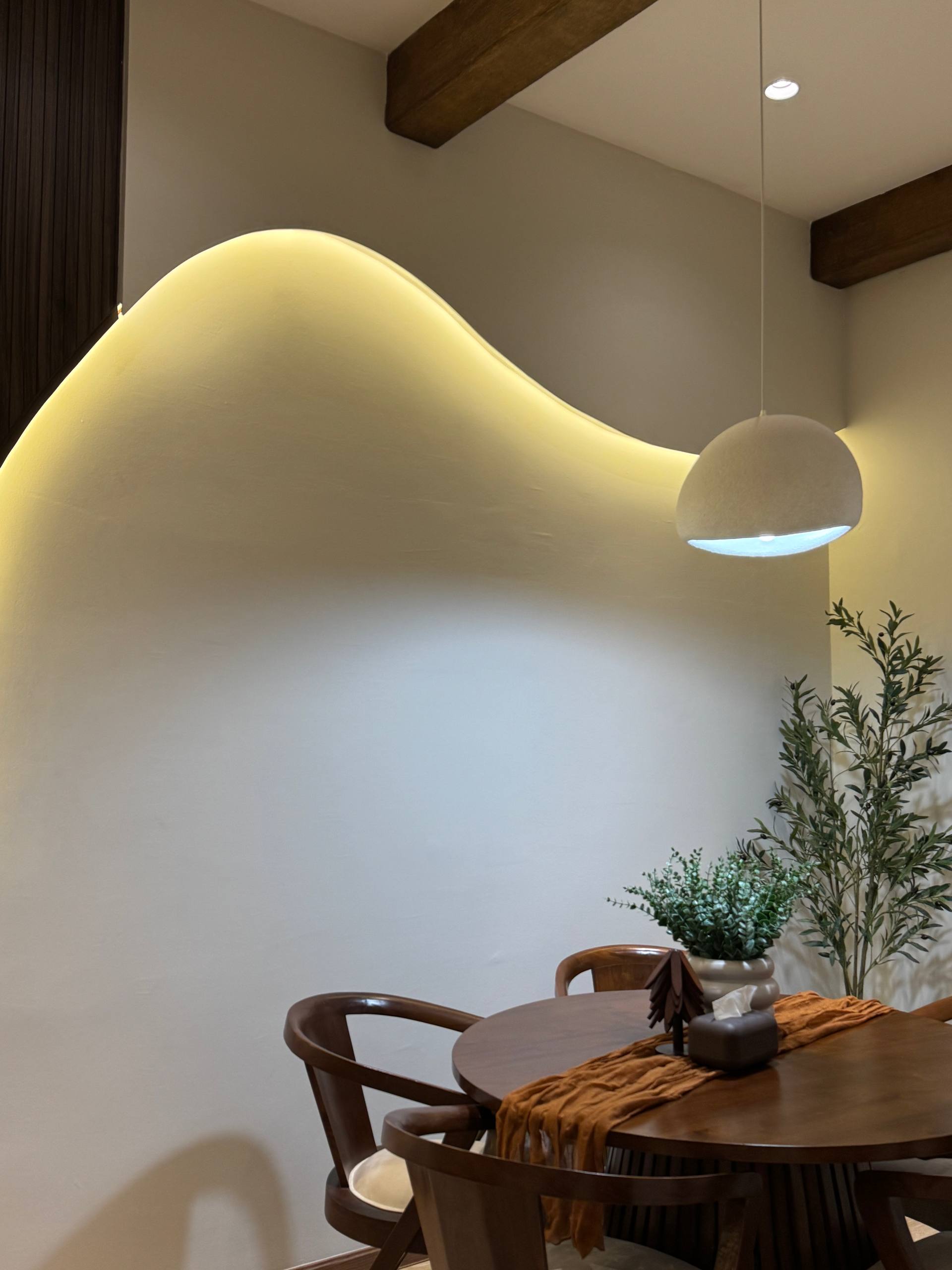 Concept: Modern warm interior emphasizing texture, lighting, and natural materials for a cozy yet elegant ambiance.
