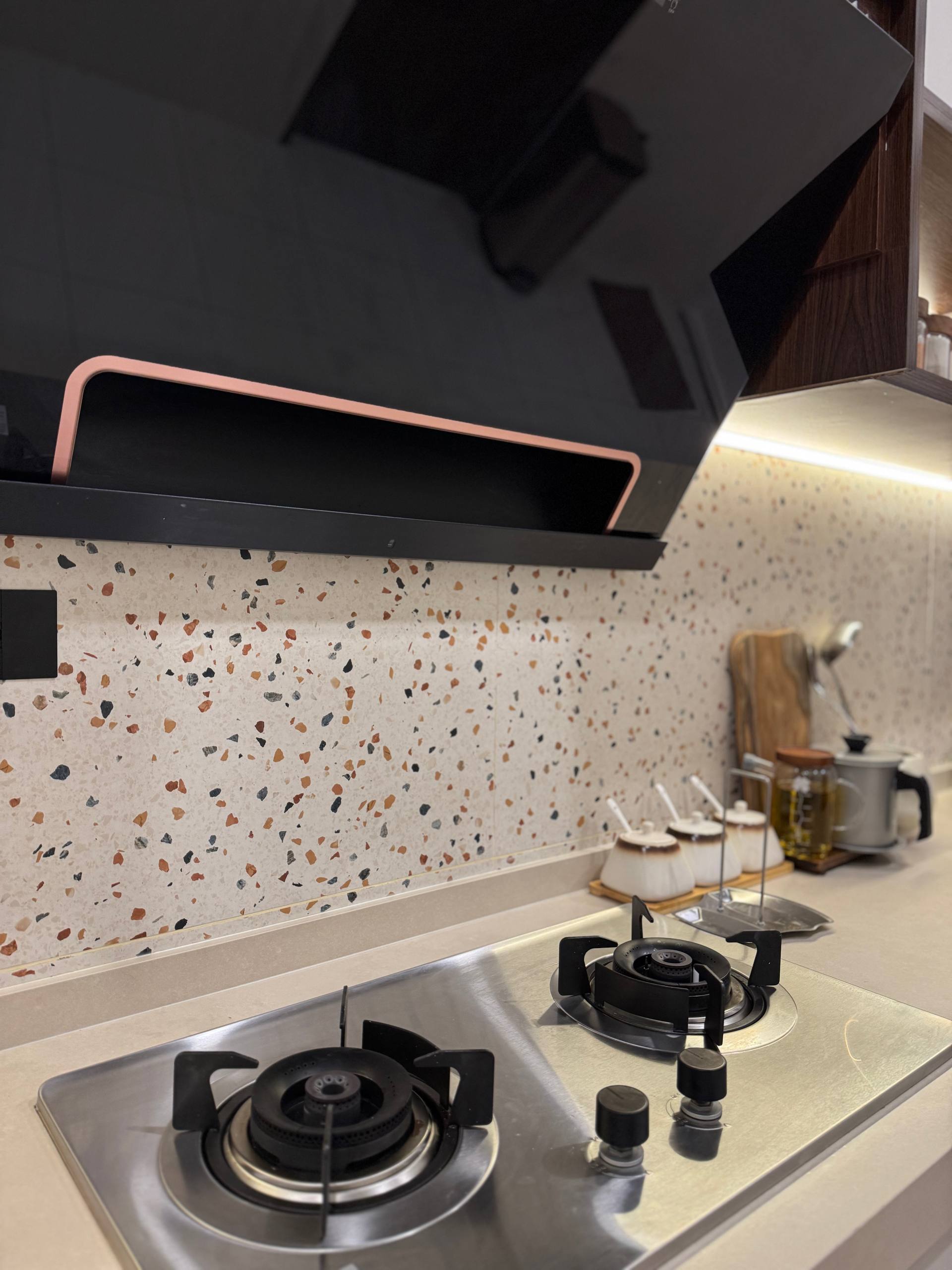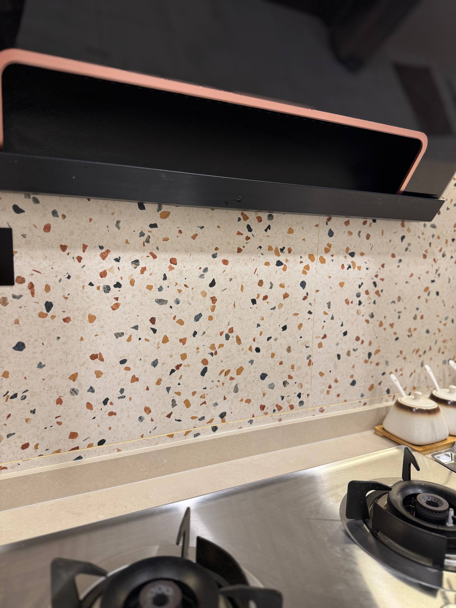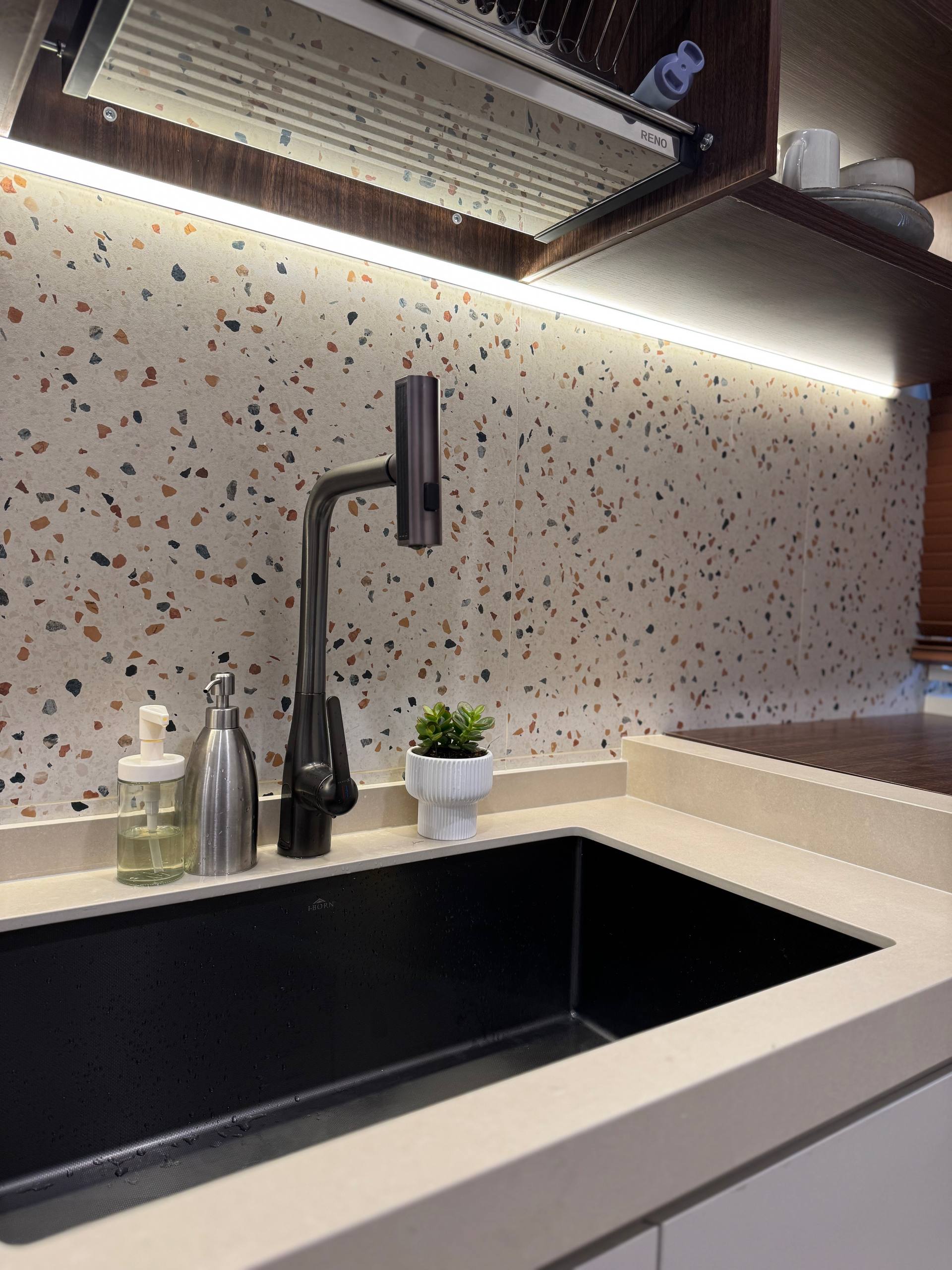 Kitchen: Full kitchen cabinetry with sintered stone finishes for a sleek and durable surface.