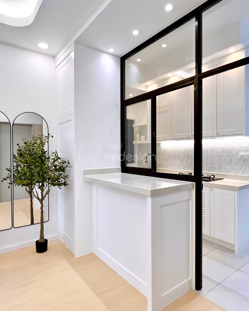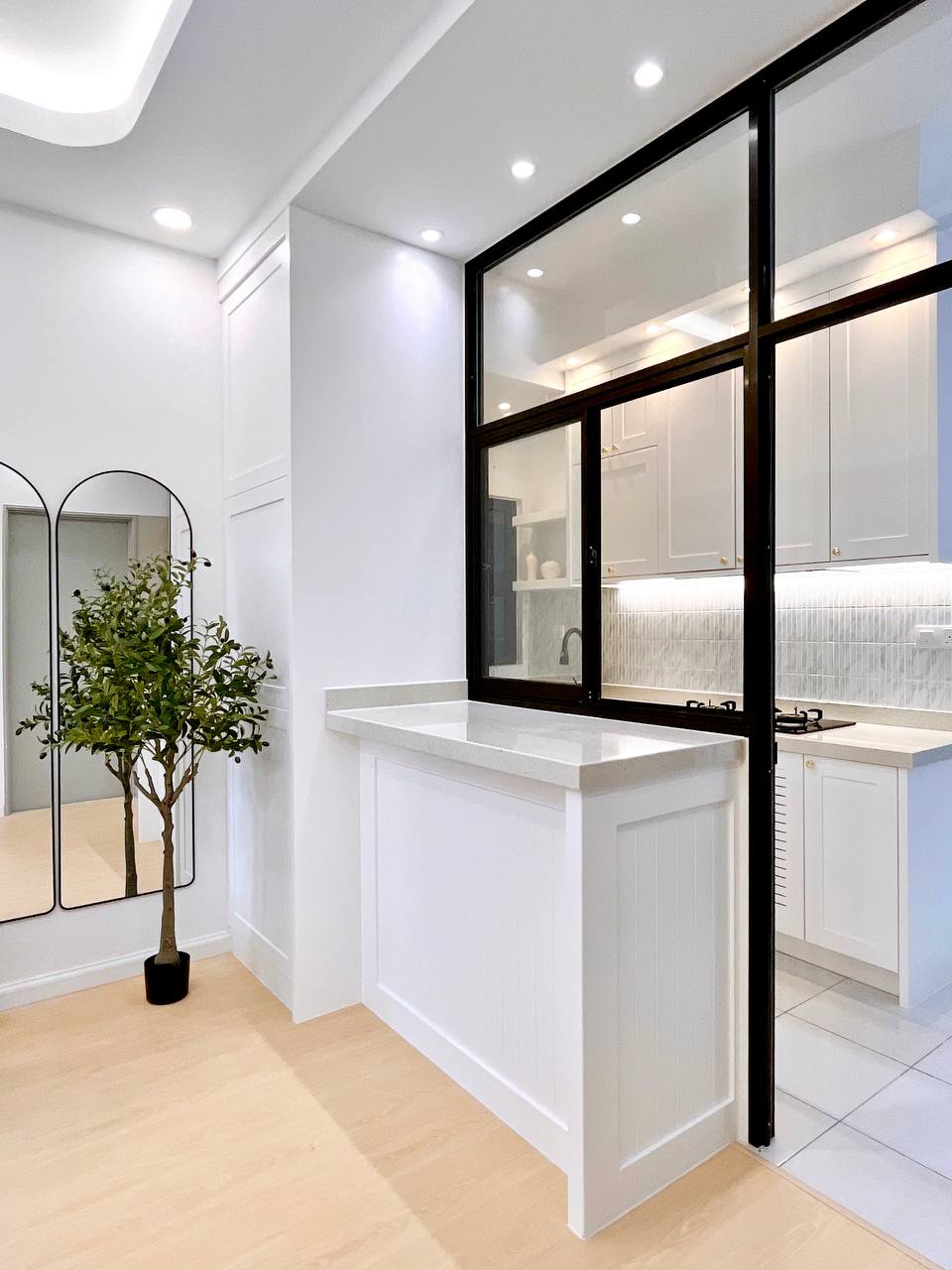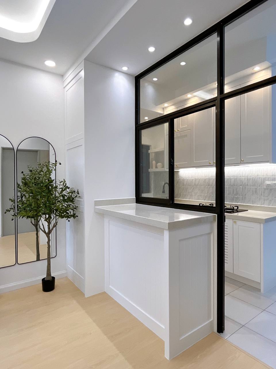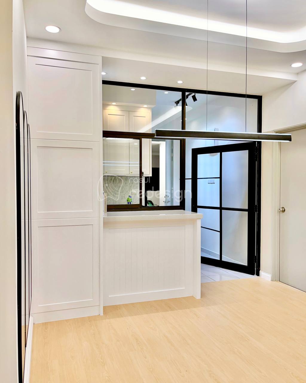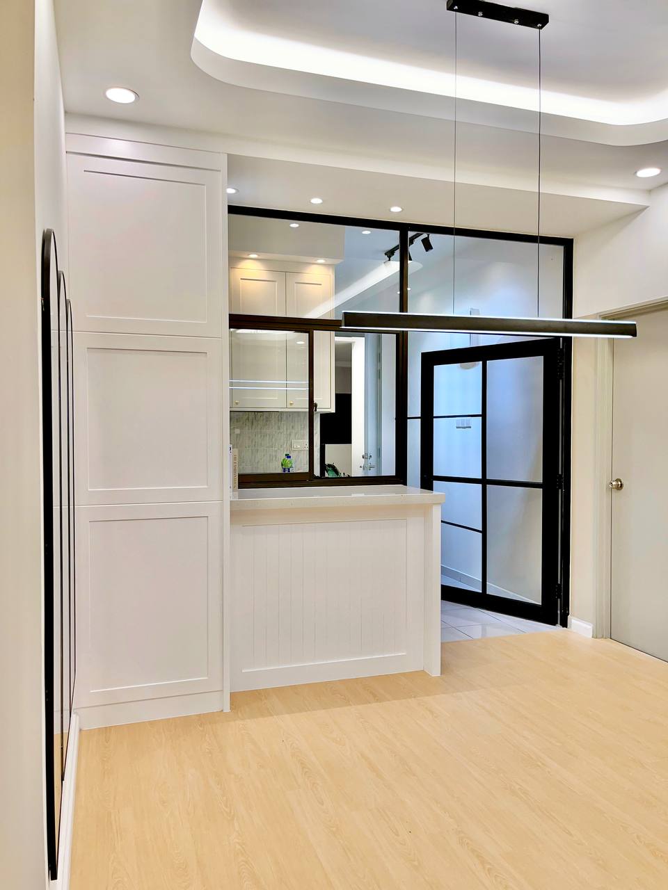 This project features a full interior design and renovation with a warm, natural concept. The space is enhanced with SPC flooring, custom solid wood cabinetry featuring a checker design, and a concrete tabletop minibar that adds texture and character.