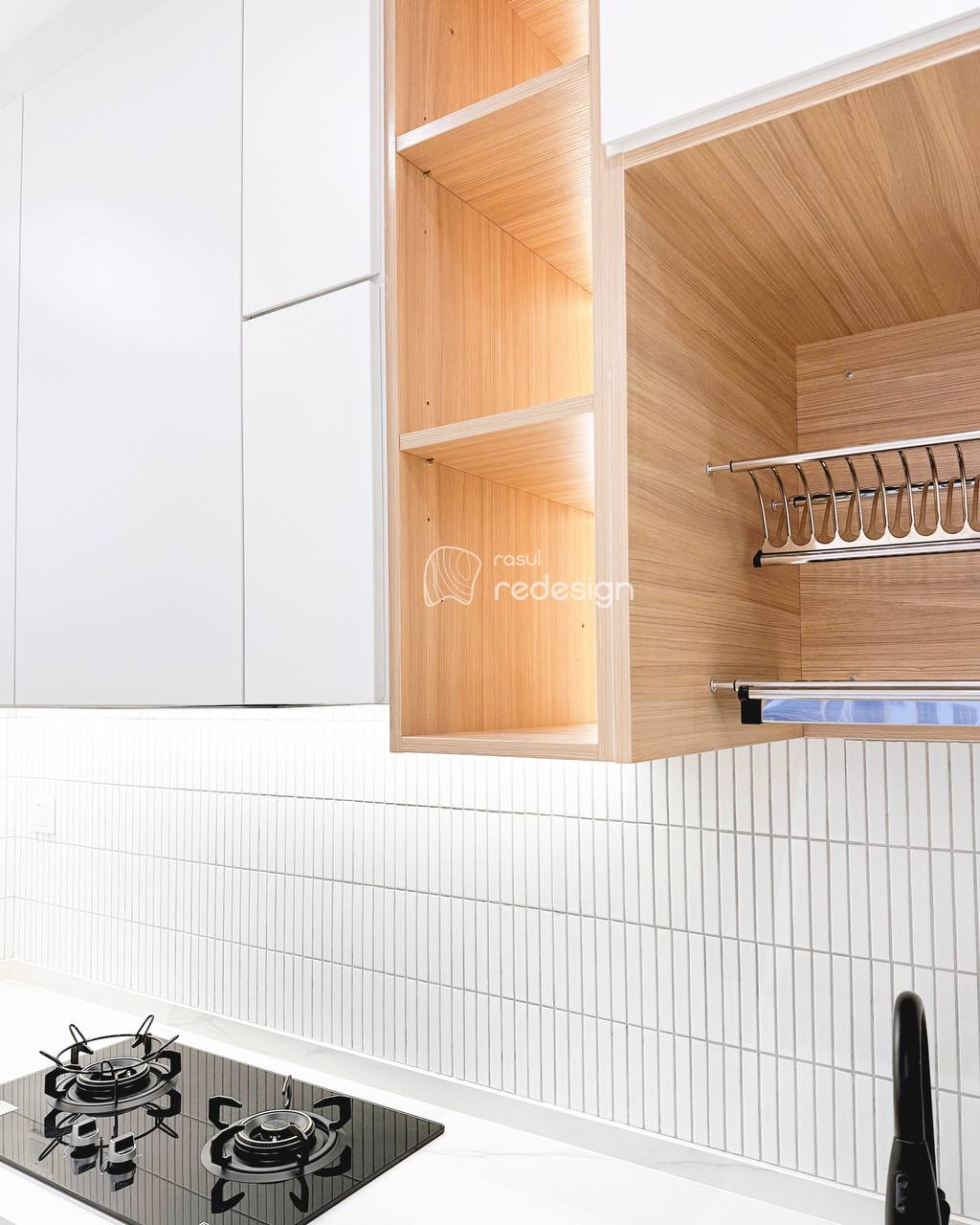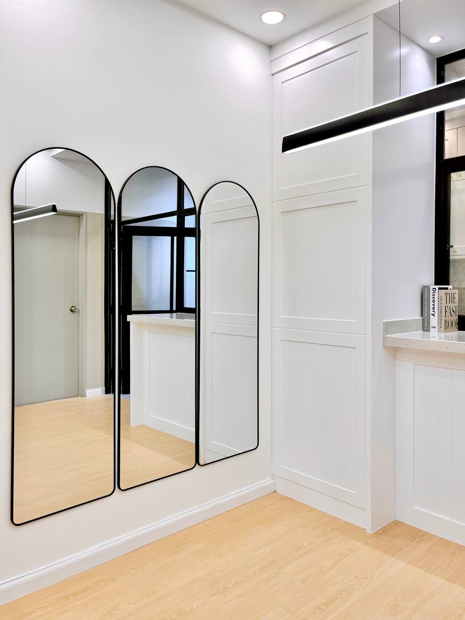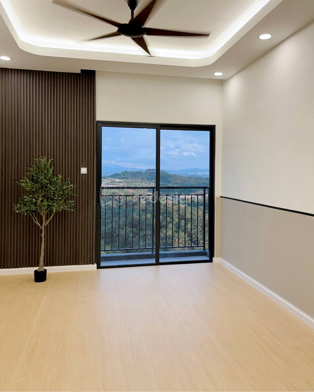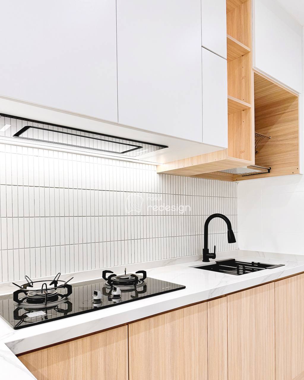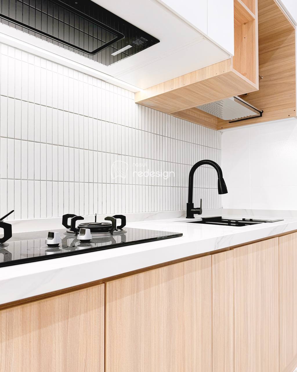 This project features a full interior design and renovation with a warm, natural concept. The space is enhanced with SPC flooring, custom solid wood cabinetry featuring a checker design, and a concrete tabletop minibar that adds texture and character.